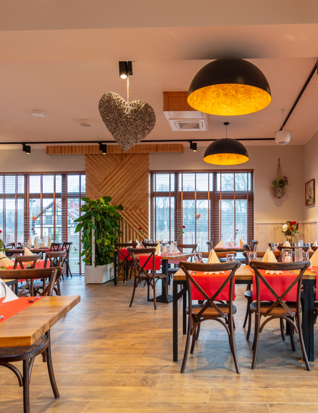 Nasza kuchnia to miejsce, gdzie tradycja spotyka się z nowoczesnością, a smaki zaskakują swoją głębią i wyjątkowością. Uwielbiamy inspirować naszych gości do odkrywania dań wegetariańskich, które potrafią oczarować nawet miłośników mięsa. Nasze menu czerpie z lokalnych, dawnych przepisów, które wzbogacamy autorskimi, często zaskakującymi dodatkami. Ogromną wagę przykładamy do poszanowania lokalnych produktów najwyższej jakości, dzięki czemu nasze potrawy odzwierciedlają najlepsze smaki regionu. Restauracja oferuje dwie przestronne sale oraz taras, z którego można podziwiać mazurskie pola i lasy. Każdego wieczoru z tarasu rozciąga się widok na zapierający dech w piersiach zachód słońca, który stanowi idealne tło dla niezapomnianych chwil spędzonych przy naszym stole.