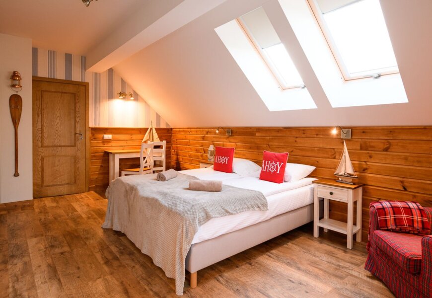 Nasze pokoje to esencja klimatu Mazur. Każdy z nich jest wyjątkowy, unikalny i niepowtarzalny - dlatego nasze pokoje nie mają numerów, ale swoje indywidualne nazwy, związane z okolicą i lokalną przyrodą: Sapina, Kormoran, Zefir… Nasz pokoje lączy jedno: wszystkie urządzone są w stylu marynistycznym, są wygodne, sprzyjają odpoczynkowi i zebraniu sił.