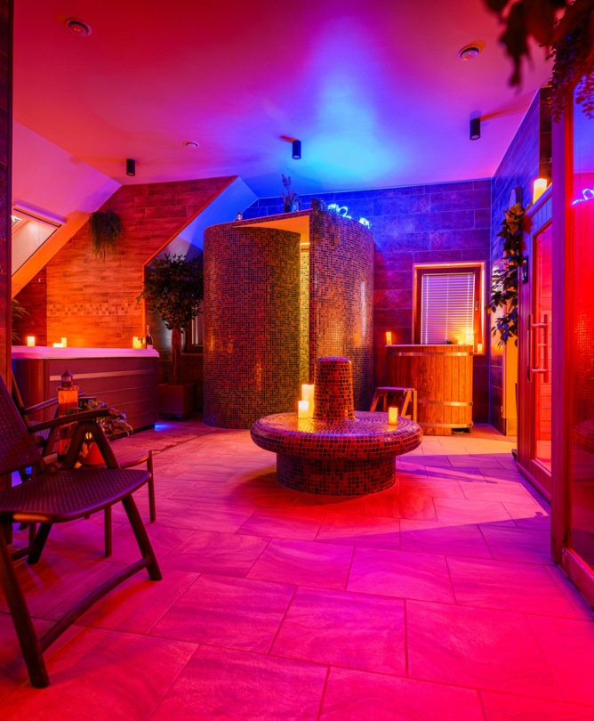 Zanurz się w spokoju naszej strefy wellness – czekają tu jacuzzi z koloroterapią, sauna fińska, sauna infrared, zimna balia i pokój relaksu. To idealne miejsce, by odpocząć, oczyścić umysł i przywrócić harmonię ciała.