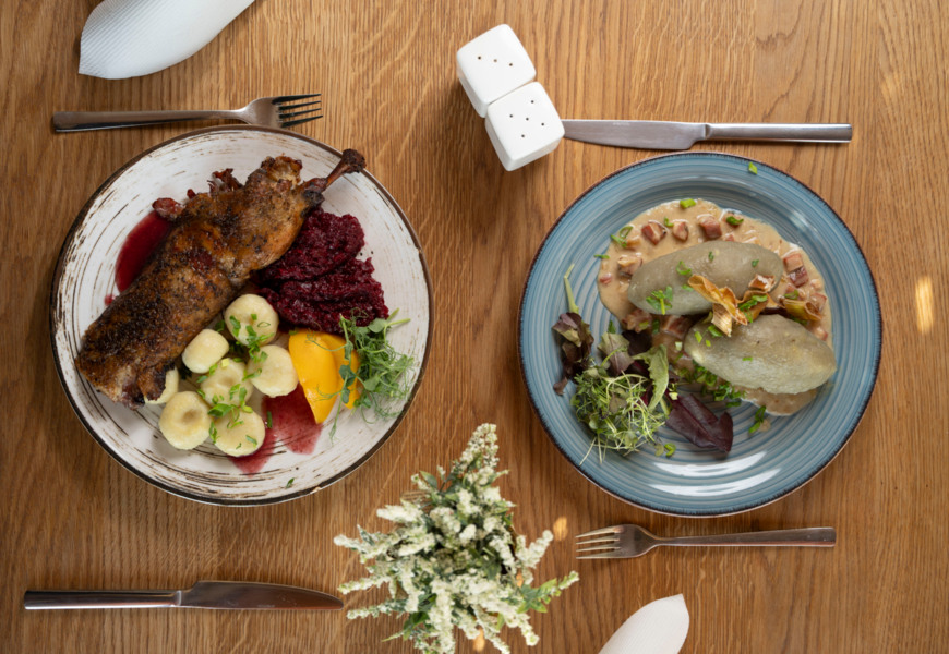 Вибір страв не випадковий – ми базуємося на стародавніх мазурських рецептах наших бабусь, але любимо дивувати вас додатками. Завдяки цьому наша кухня — це смаки «як вдома», але завжди у несподіваному поєднанні. Мазурський суп з раком? Шніцель з персиком? Таке меню лише у нас!